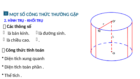 2. HÌNH TRỤ - KHỐI TRỤ Các thông số là bán kính. là đường sinh. là chiều cao. .