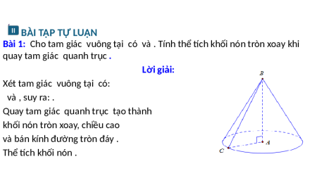Bài 1: Cho tam giác vuông tại có và . Tính thể ch khối nón tròn xoay khi