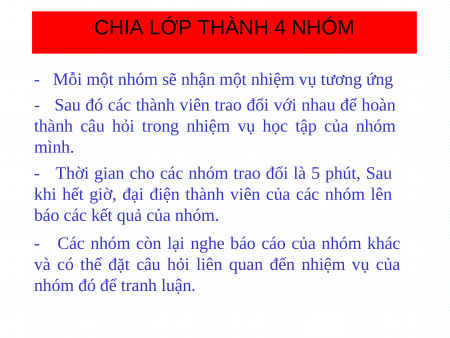 - Các nhóm còn lại nghe báo cáo của nhóm khác