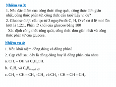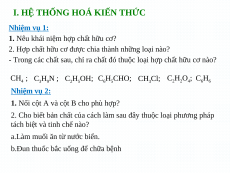 - Trong các chất sau, chỉ ra chất đó thuộc loại hợp chất hữu cơ nào? CH ; C H N ; C H OH; C H CHO; 6 5 CH Cl; C H O ; C H 4 3 9 2 5 3 2 2 4 6 6 Nhiệm vụ 2: