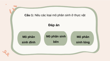 Câu 1: Nêu các loại mô phân sinh ở thực vật Đáp án Mô phân Mô phân sinh Mô phân sinh đỉnh bên sinh lóng
