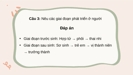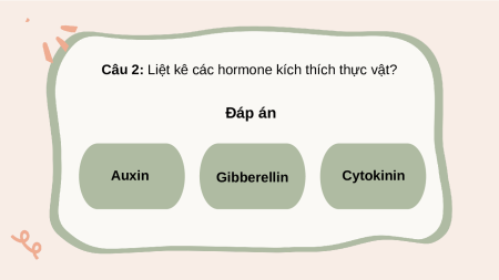 Câu 2: Liệt kê các hormone kích thích thực vật? Đáp án Auxin Gibberellin Cytokinin