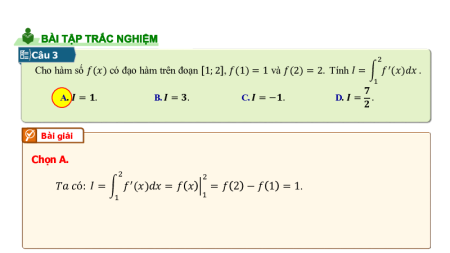 Cho hàm số ?(?) có đạo hàm trên đoạn 1; 2 , ?(1) = 1 và ?(2) = 2. Tính ? = ?′(?)?? . 1 ? A. ? = ?. B. ? = ?. C. ? = −?. D. ? = . ? Bài giải Chọn A. 2 2