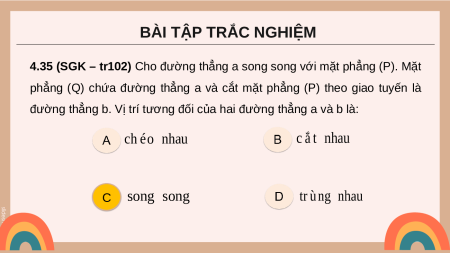 đường thẳng b. Vị trí tương đối của hai đường thẳng a và b là: ch éo nhau c ắ t nhau C song song tr ùng nhau