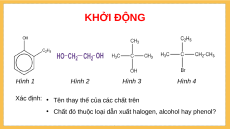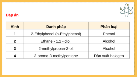 • Chất đó thuộc loại dẫn xuất halogen, alcohol hay phenol? Đáp án Hình Danh pháp Phân loại 1 2-Ethylphenol (o-Ethylphenol) Phenol 2 Ethane - 1,2 - diol. Alcohol 3 2-methylpropan-2-ol. Alcohol 4 3-bromo-3-methylpentane Dẫn xuất halogen ÔN TẬP CHƯƠNG 5