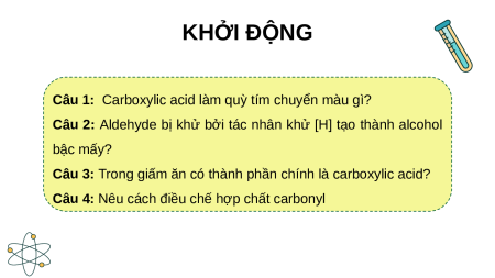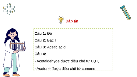 Câu 4: Nêu cách điều chế hợp chất carbonyl Đáp án Câu 1: Đỏ Câu 2: Bậc I Câu 3: Acetic acid Câu 4: