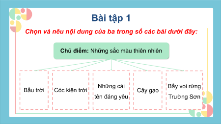 Chủ điểm: Những sắc màu thiên nhiên Những cái Bầy voi rừng Bầu trời Cóc kiện trời Cây gạo tên đáng yêu Trường Sơn