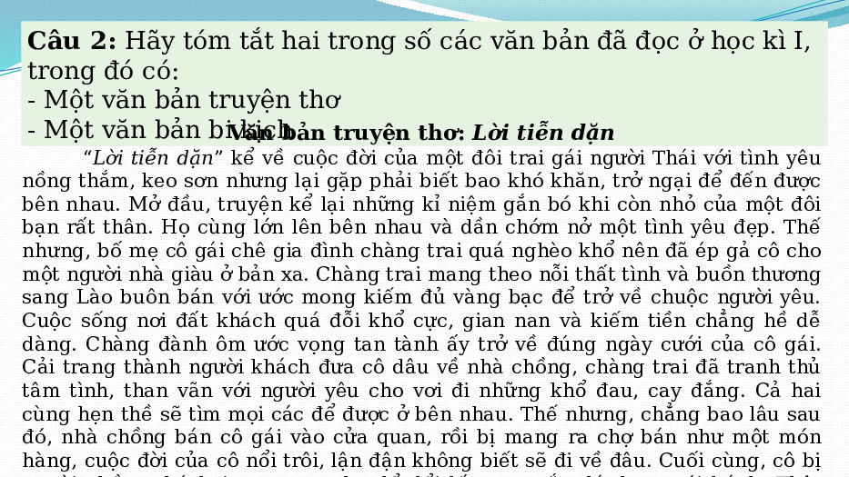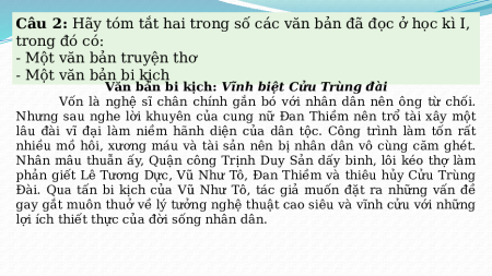 Câu 2: Hãy tóm tắt hai trong số các văn bản đã đọc ở học kì I, trong đó có: