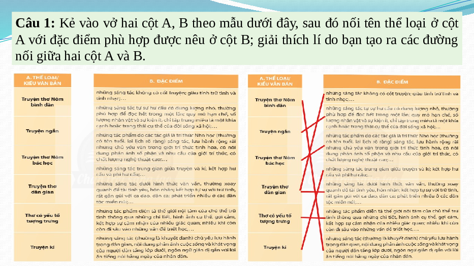 Câu 1: Kẻ vào vở hai cột A, B theo mẫu dưới đây, sau đó nối tên thể loại ở cột