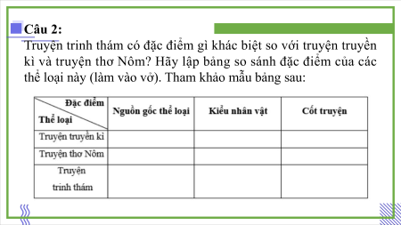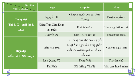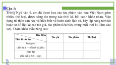 vở). Tham khảo mẫu bảng sau: Đặc điểm Tác giả Tác phẩm Thể loại Thời kì văn học