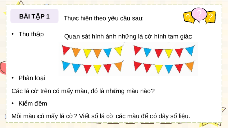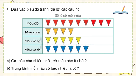 Mỗi màu có mấy lá cờ? Viết số lá cờ các màu để có dãy số liệu.