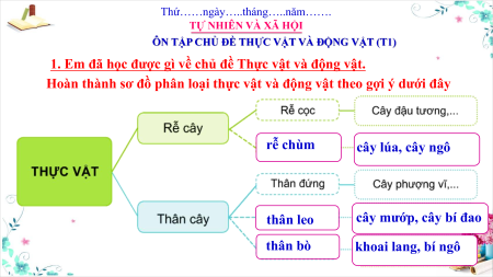 Hoàn thành sơ đồ phân loại thực vật và động vật theo gợi ý dưới đây rễ chùm cây lúa, cây ngô thân leo