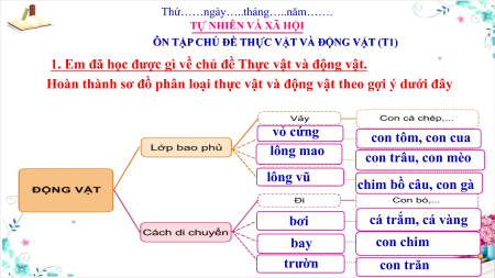 Hoàn thành sơ đồ phân loại thực vật và động vật theo gợi ý dưới đây vỏ cứng con tôm, con cua lông mao con trâu, con mèo lông vũ chim bồ câu, con gà bơi cá trắm, cá vàng bay con chim trườn con trăn