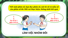 của phân số đó. Đổi vai thực hiện, thống nhất kết quả. 3 1 5 9 Tử số là 3 Tử số là 1 Mẫu số là 5 Mẫu số là 9 LÀM VIỆC NHÓM ĐÔI (SGK TRANG 11,12)