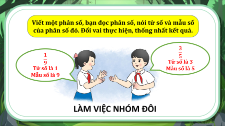 Viết một phân số, bạn đọc phân số, nói tử số và mẫu số