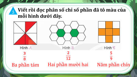 1 mỗi hình dưới đây. 1 3 2 5 8 12 9 Ba phần tám Hai phần mười hai Năm phần chín
