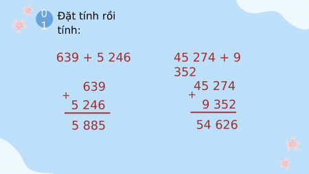 LUYỆN TẬP 0 Đặt tính rồi 1 tính: 639 + 5 246 45 274 + 9 352 639 45 274 + + 5 246 9 352 5 885 54 626 0 Đặt tính rồi 1 tính: 13 627 – 8 454 86 769 – 78 495 13 627 86 769 - - 8 454 78 495 5 173 8 274