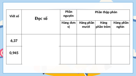 biết mỗi chữ số của các số đó thuộc hàng nào. a) 6,37 b) 0,945