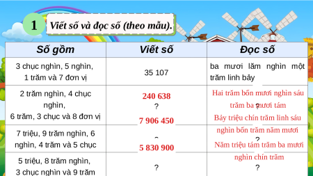 1 Viết số và đọc số (theo mẫu). Số gồm Viết số Đọc số 3 chục nghìn, 5 nghìn, ba mươi lăm nghìn một 35 107 1 trăm và 7 đơn vị trăm linh bảy 2 trăm nghìn, 4 chục 240 638