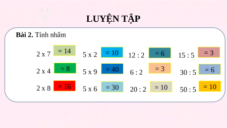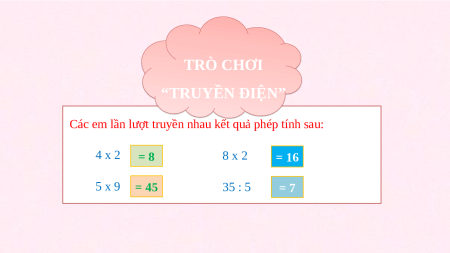 Các em lần lượt truyền nhau kết quả phép tính sau: 4 x 2 = 8 8 x 2 = 16 5 x 9 = 45 35 : 5 = 7 BÀI 96