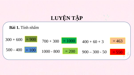 ÔN TẬP VỀ SỐ VÀ PHÉP TÍNH TRONG PHẠM VI 1000 (TIẾP THEO) LUYỆN TẬP Bài 1. Tính nhẩm 300 + 600 = 900 700 + 300 = 1000 400 + 60 + 3 = 463 500 - 400 = 100 1000 - 800 = 200 900 – 300 - 50 = 550