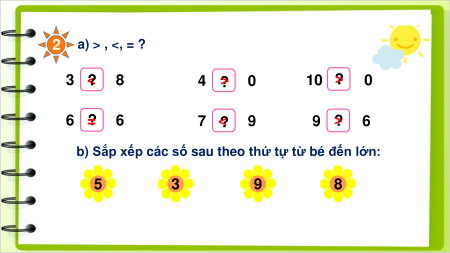 Bài 38: Ôn tập – Tiết 1 LUYỆN TẬP 1 Số? ? 7 ? 10 ? 8 ? 9 ? 5 ? 4 2 2 a) > , <, = ? 3 < ? 8 4 ? > 0 10 ? > 0 6 ? = 6 7 ? < 9 9 ? > 6