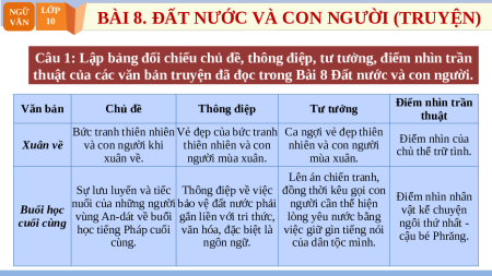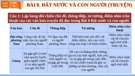 Câu 1: Lập bảng đối chiếu chủ đề, thông điệp, tư tưởng, điểm nhìn trần
