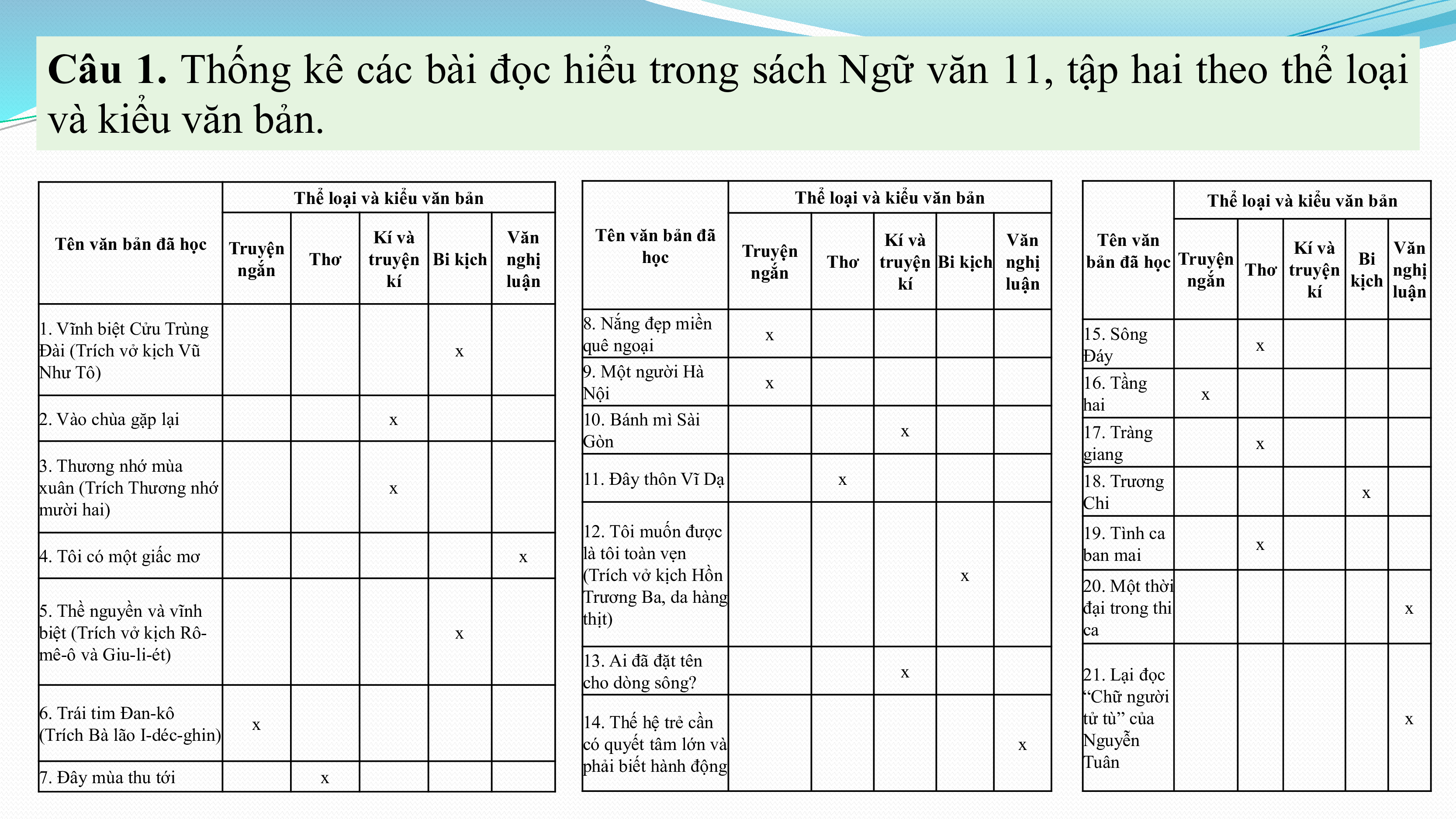 Câu 1. Thống kê các bài đọc hiểu trong sách Ngữ văn 11, tập hai theo thể loại và kiểu văn bản.