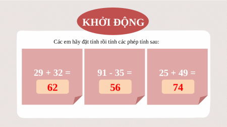 Các em hãy đặt tính rồi tính các phép tính sau: 29 + 32 = 91 - 35 = 25 + 49 = 62 56 74 BÀI 48 : ÔN TẬP VỀ PHÉP CỘNG, PHÉP TRỪ TRONG PHẠM VI 100