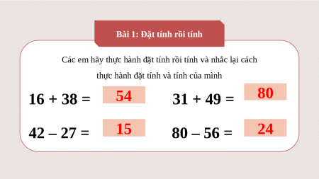 thực hành đặt tính và tính của mình 16 + 38 = ? 54 31 + 49 = ? 80 42 – 27 = ? 15 80 – 56 = ? 24
