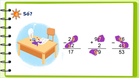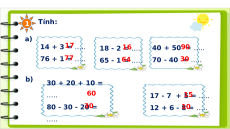 phép trừ trong phạm vi 100 1 Tính: a) 14 + 3 = 1 7….. 18 - 2 = 1 … 6 .. 40 + 50 9= 0 ….. 76 + 1 = 7 7 ….. 65 - 1 = 6 4….. 70 - 40 = 3 0 ….. b) 30 + 20 + 10 = ….. 60 17 - 7 + 5 1 = 5 ….. 80 - 30 - 20 3 = 0 12 + 6 - 8 1 = 0 ….. …..