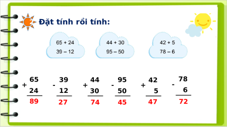 2 Đặt tính rồi tính: 65 39 44 95 42 78 + - + - + - 24 12 30 50 5 6 89 27 74 45 47 72