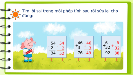 Tìm lỗi sai trong mỗi phép tính sau rồi sửa lại cho 3 đúng: 54 54 46 46 6 6 - - + + + 2 + 2 3 3 32 32 34 52 76 49 92 38