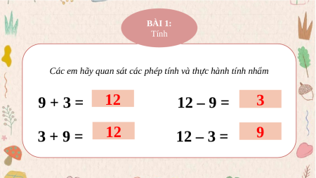 Các em hãy quan sát các phép tính và thực hành tính nhẩm 9 + 3 = ? 12 12 – 9 = ?3 3 + 9 = ? 12 12 – 3 = ?9