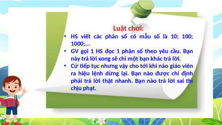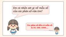 phải trả lời thật nhanh. Bạn nào trả lời sai thì chịu phạt. Em có nh n ậ xét gì v ề m u ẫ s ố c a c ủ ác phân s v ố a tìm? ừ Các phân s đ ố u c ề ó m u s ẫ ố là 10; 100; 1000;....