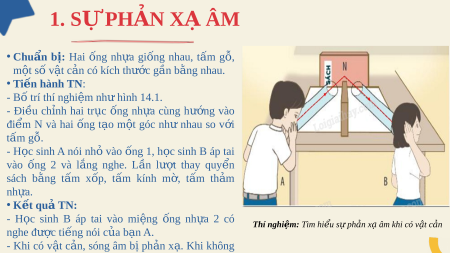 - Bố trí thí nghiệm nh hì ư nh 14.1. - Đi u ề ch nh ỉ hai tr c ụ ng ố nh a ự cùng hư ng ớ vào điểm N và hai ng ố t o ạ m t ộ góc nh ư nhau so v i ớ t m g ấ ỗ. - H c ọ sinh A nói nh ỏ vào ng ố 1, h c ọ sinh B áp tai vào ống 2 và l ng ắ nghe. L n ầ l t ượ thay quy n ể sách b ng ằ t m ấ x p, ố t m ấ kính m , ờ t m ấ th m ả nh a ự . • K t q ế u ả TN: