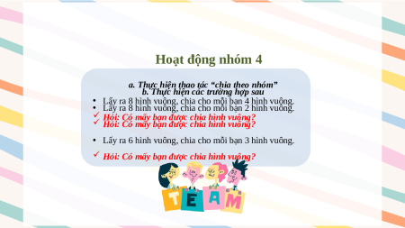 Hỏi: Có mấy bạn được chia hình vuông? BÀI 58 PHÉP CHIA