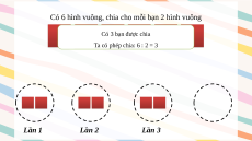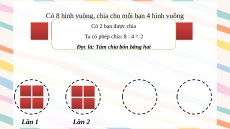 Có 8 hình vuông, chia cho mỗi bạn 4 hình vuông Có 2 bạn được chia Ta có phép chia: 8 : 4 = 2