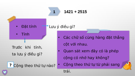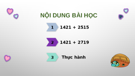 tạo không khí lớp học vui tươi. PHÉP CỘNG CÁC SỐ TRONG PHẠM VI 10 000 (2 tiết) NỘI DUNG BÀI HỌC 1 1421 + 2515 2 1421 + 2719 3 Thực hành