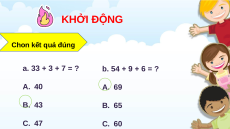 CÁC EM ĐẾN TIẾT HỌC HÔM NAY KHỞI ĐỘNG Chon kết quả đúng a. 33 + 3 + 7 = ? b. 54 + 9 + 6 = ? A. 40 A. 69 B. 43 B. 65 C. 47 C. 60 Chủ đề 4: