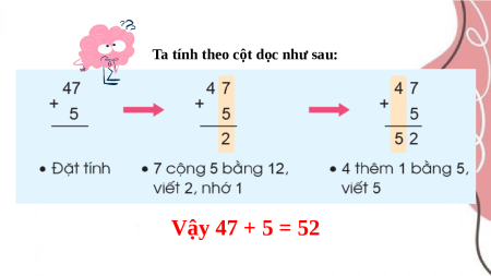 Ta tính theo cột dọc như sau: Vậy 47 + 5 = 52