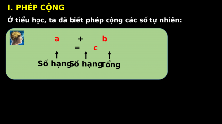 Ở tiểu học, ta đã biết phép cộng các số tự nhiên: a + b = c Số hạng Số hạn T g ổng Khi đổi chỗ các