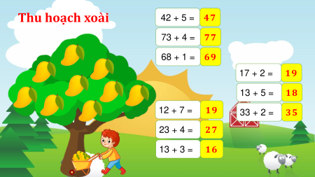 Thu hoạch xoài 42 + 5 = 47 73 + 4 = 77 68 + 1 = 69 17 + 2 = 19 13 + 5 = 18 12 + 7 = 19 33 + 2 = 35 23 + 4 = 27 13 + 3 = 16