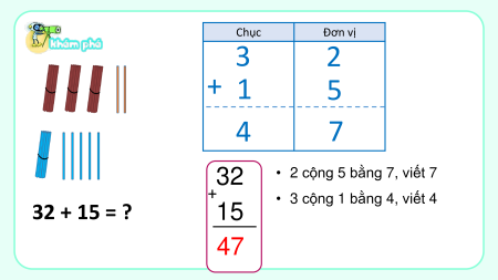 • 3 cộng 1 bằng 4, viết 4 32 + 15 = ? 15 47