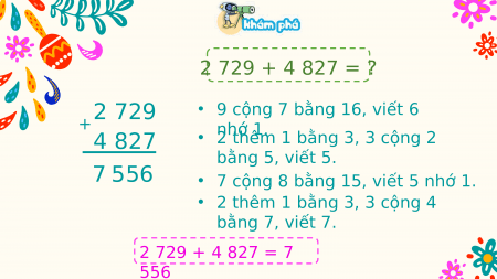 • 2 thêm 1 bằng 3, 3 cộng 4 bằng 7, viết 7. 2 729 + 4 827 = 7 556
