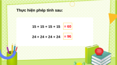 Thực hiện phép tính sau: 15 + 15 + 15 + 15 = 60 24 + 24 + 24 + 24 = 96