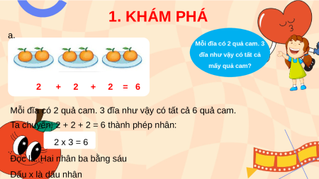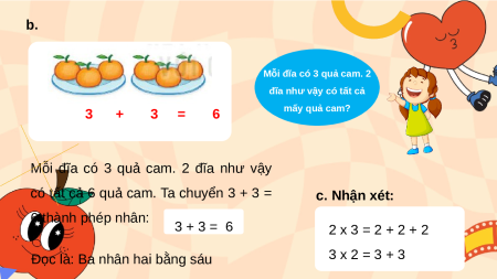 Ta chuyển: 2 + 2 + 2 = 6 thành phép nhân: 2 x 3 = 6