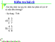 - Em hãy nhắc lại quy tắc nhân hai phân số (có tử và mẫu đều dương)? - Áp dụng : Tính 8 3 a) . 3 7 4 5 b) . 6 8