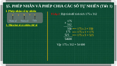 1. Nhân hai số có nhiều chữ số 312 350 175 x 2 = 350 175 175 x 1 = 175 525 175 x 3 = 525 54600 Vậy 175 x 312 = 54 600