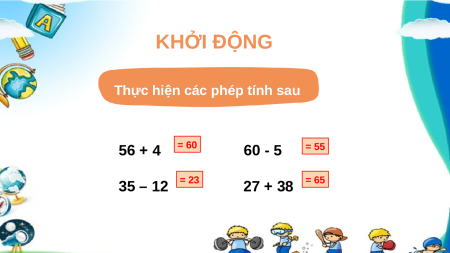 Thực hiện các phép tính sau 56 + 4 6 = 60 0 - 5 = 55 35 – 12 2 = 23 7 + 38 = 65 BÀI 23: